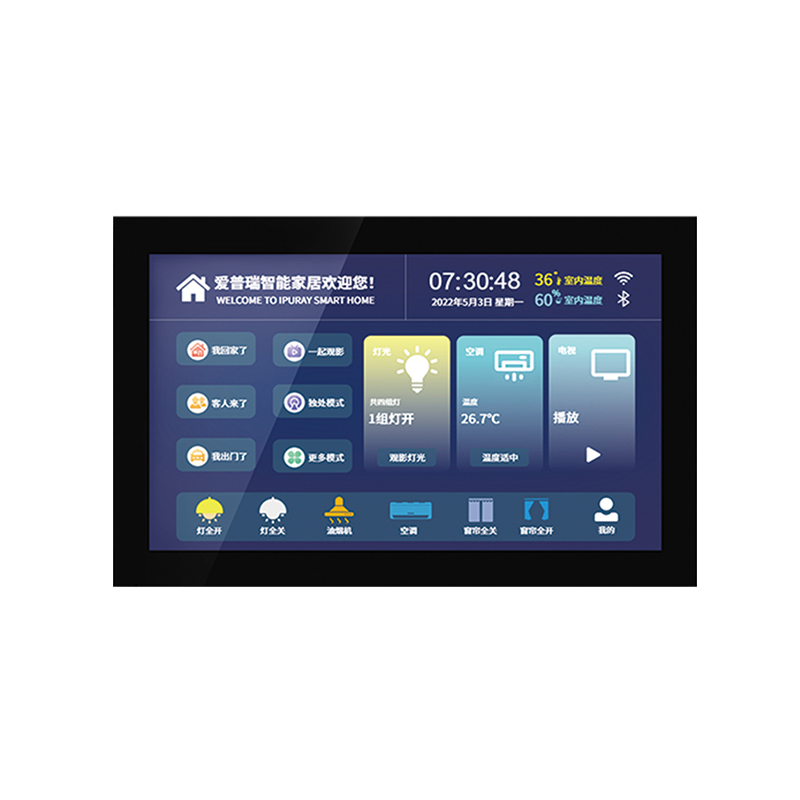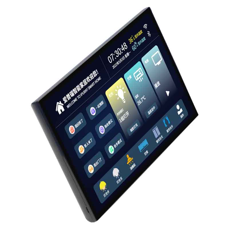 全屏液晶显示触摸中控器,是一个可视的控制中心,内设Wi-Fi、蓝牙、RF2.4G通信模块,便于和各种传感器及控制终端组网,智能控制各种电器设备。用户可自主编程组建个性化智能家居控制系统。产品有二种不同屏幕尺寸可供选择,用户即可在面板上操作,也可通过手机远程设置参数及控制家用设备。